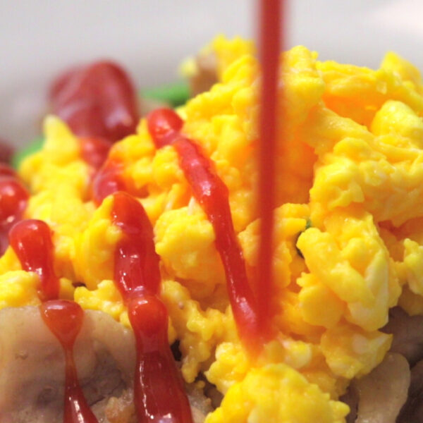 2のフライパンをキッチンペーパーでふき取って再び火にかけ、溶いた卵を入れて細かく炒り卵を作り、2の中央に盛り付ける。