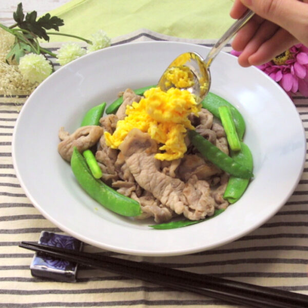 ・卵を「ミモザ」という小さな黄色の花に見立てた彩のよい野菜炒めです。