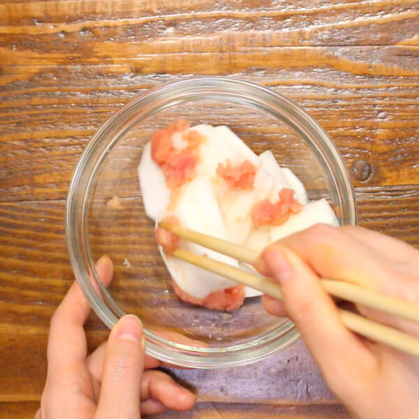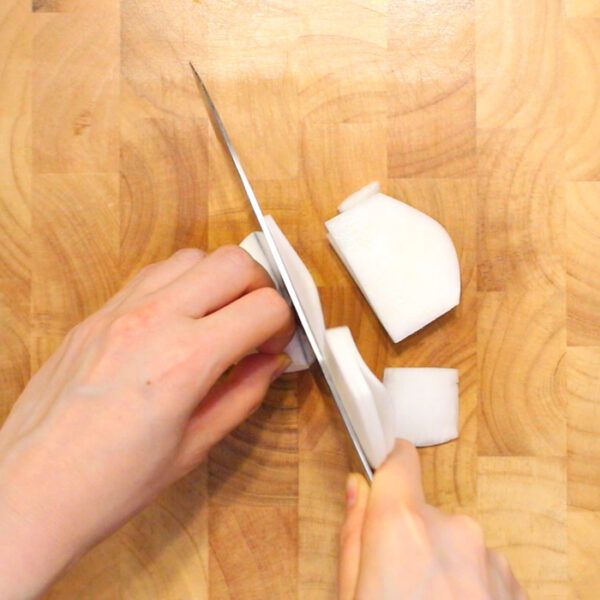 かぶは厚めに皮をむいて3mm程度の薄切りにする。