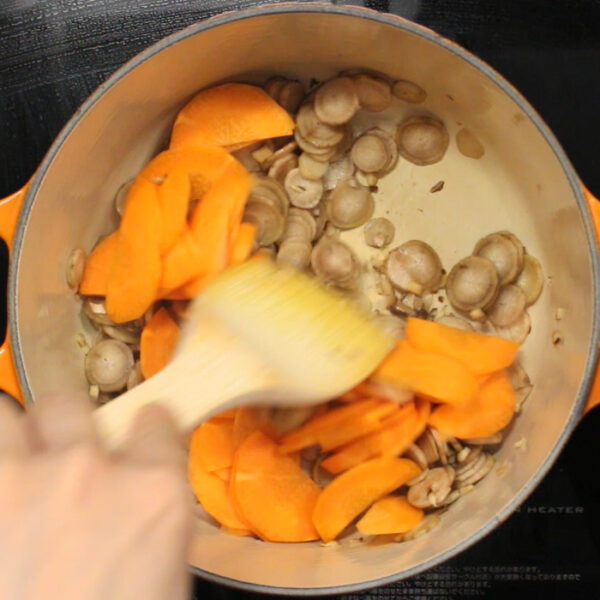 鍋にごま油をひき、干し椎茸、新ごぼう、にんじんの順で炒める。