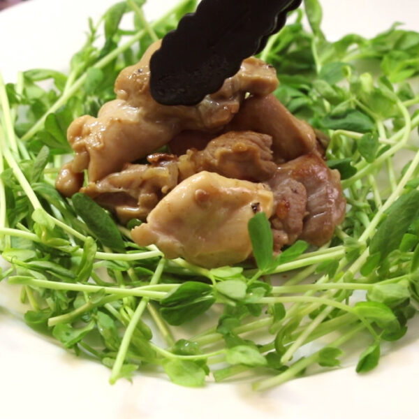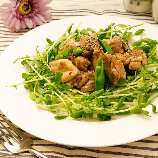 器に豆苗を敷いて、その上に鶏肉とスナップエンドウを盛り付け、黒胡椒を振る。