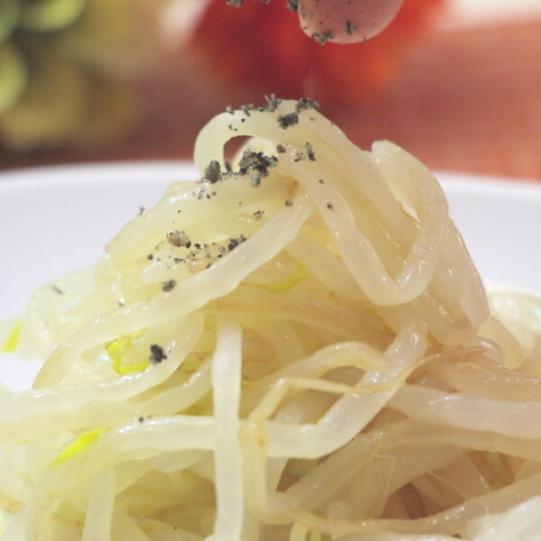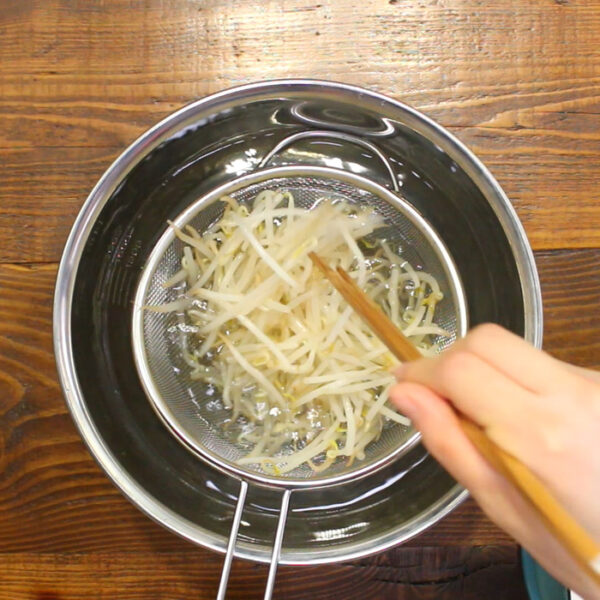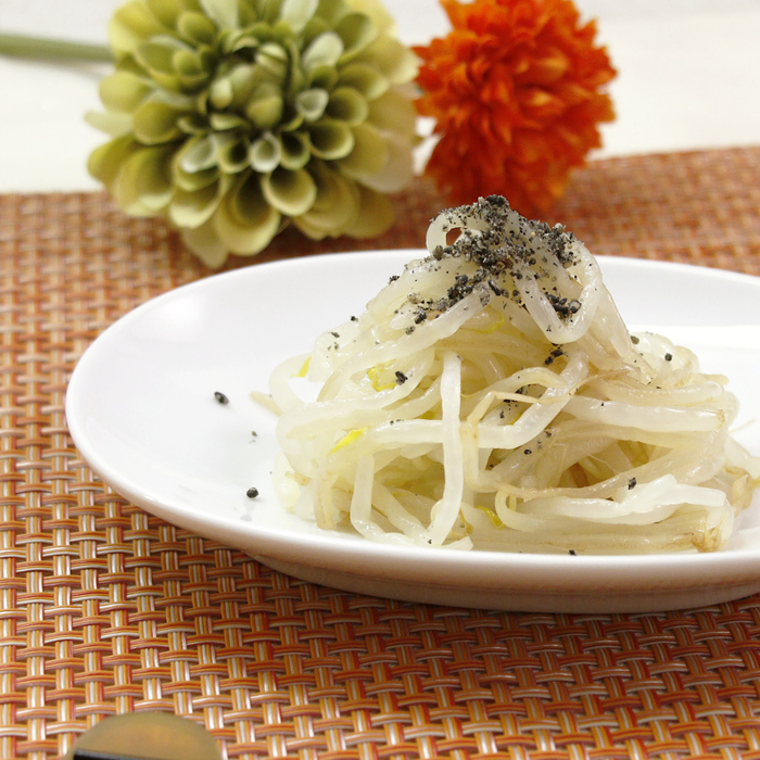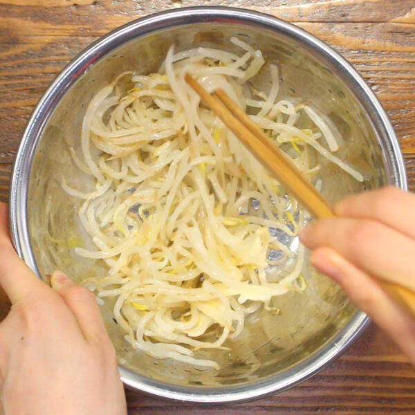 ・シンプルなもやしのナムル。たくさん食べても罪悪感はありません。もやしの臭みをなくしつつ食感を残すポイントは加熱の仕方にあります。