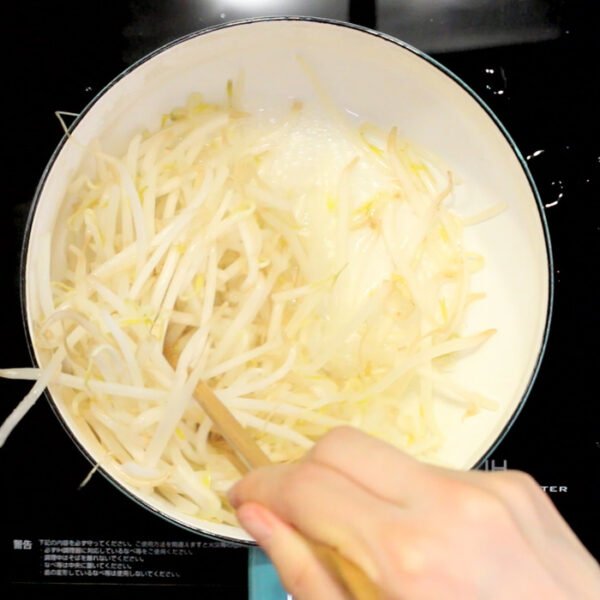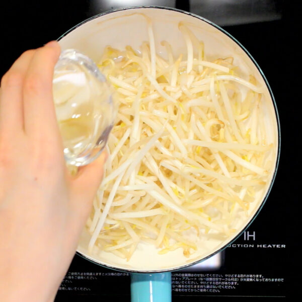 もやしは水でよく洗い、鍋に入れて大さじ3の水を注ぎ、蓋をして中火で加熱する。