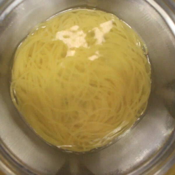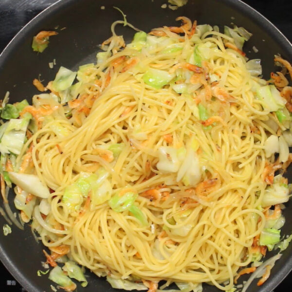 5にお湯を切ったスパゲッティを加えて、塩で味を調える。