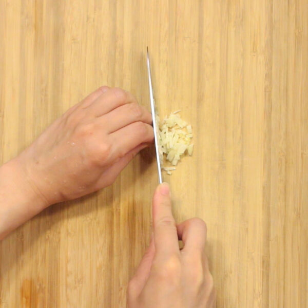 にんにくはみじん切りにする。鷹の爪は半分にカットし、中の種を取り除く。