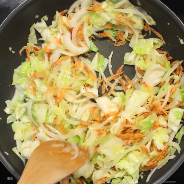 香りが出てきたら、2を加えて炒める。全体に油が回ったら桜えびを加え炒め、パスタの茹で汁を加え少し煮る。