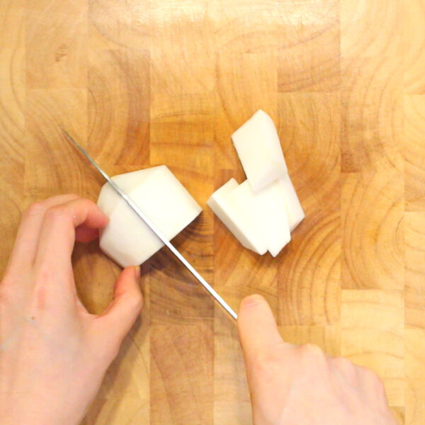 かぶの実は食べやすい大きさに切る。葉は3cmくらいの長さに切る。