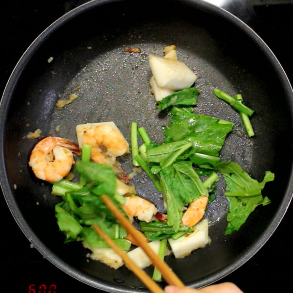 エビが色づいたら、1、水、かぶの葉をいれて、全体を混ぜ合わせる。
