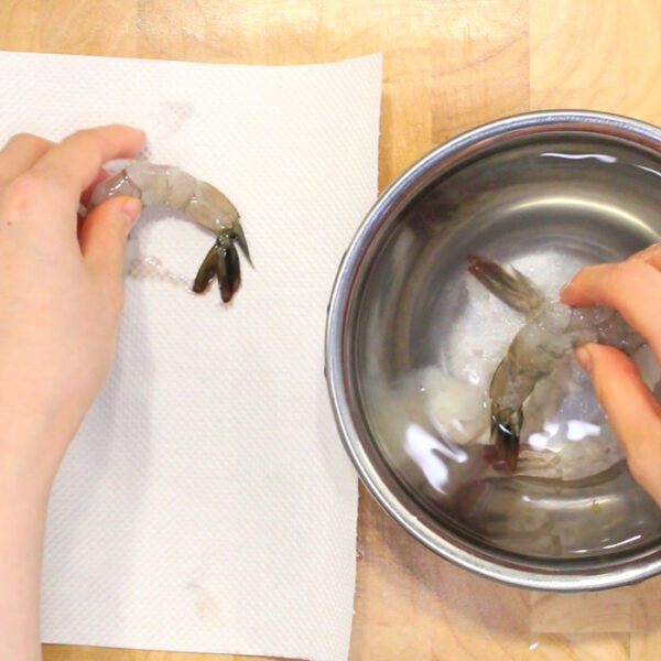エビは、殻をむいて背ワタを取る。塩(分量外)小さじ1を揉み込んで水で洗い、キッチンペーパーでふきとる。