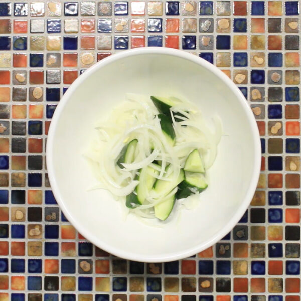 きゅうり、たまねぎに塩をふって全体をもみこみ、少し時間をおいて軽く絞る。