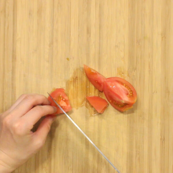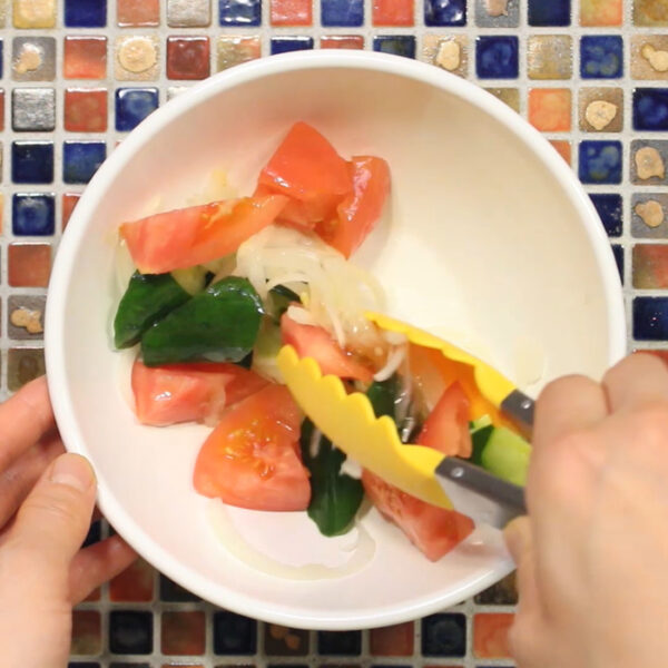 トマト、きゅうりは一口大に切る。たまねぎは薄切りにする。