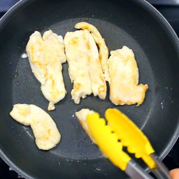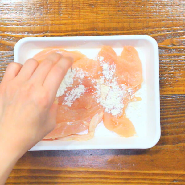 ・脂肪が少なく、硬いイメージがある鶏むね肉ですが、小麦粉をふりソテーをすることでジューシーに仕上がります。