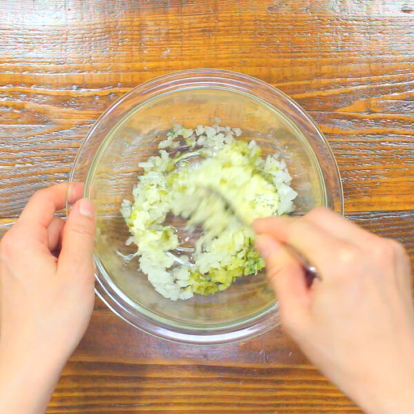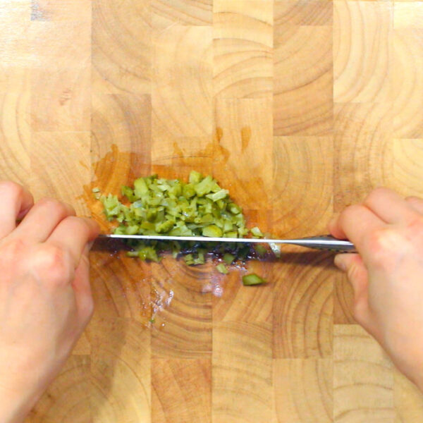ピクルス、たまねぎをみじん切りする。たまねぎはみじん切りにした後、水にさらして水気をしっかりきる。