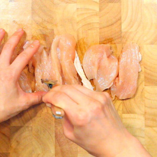 鶏むね肉は、身の厚い部分を包丁で開いて食べやすい大きさに切り、火の通りが良いようにフォークで穴を数か所あける。