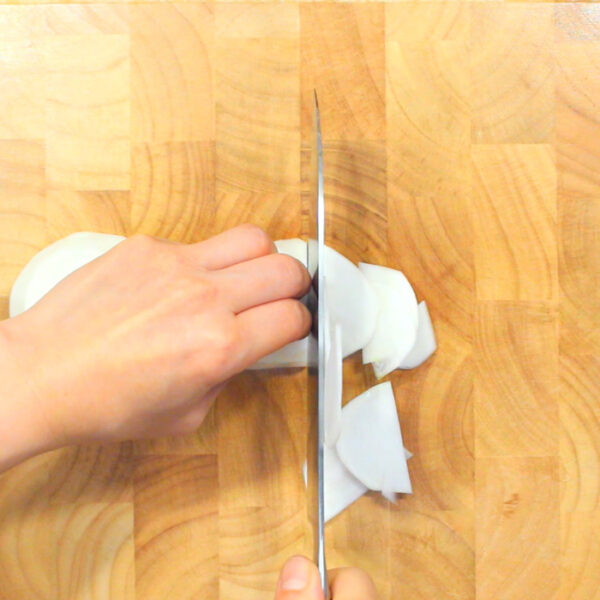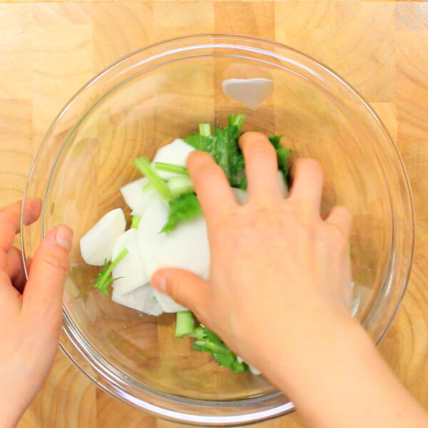 かぶの根は皮をむき、薄切りにする。