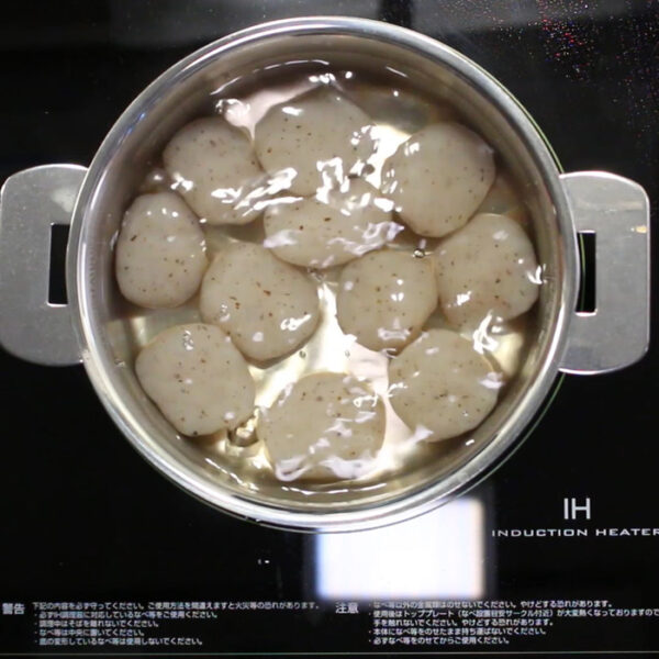 小玉こんにゃくは熱湯で約3分茹でてあくを抜く。