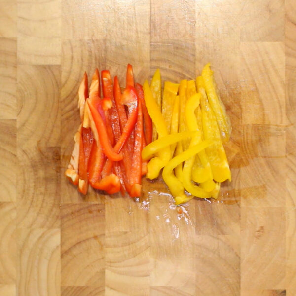 赤パプリカ、黄パプリカは繊維にそって細切りにする。