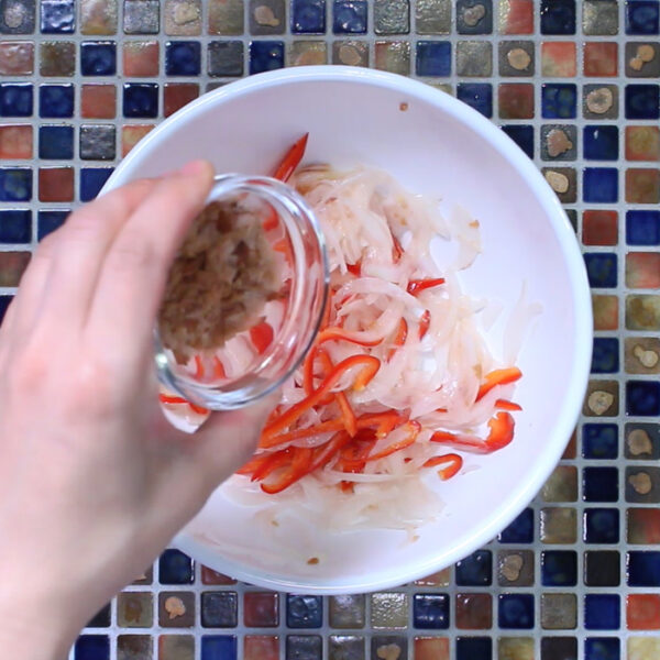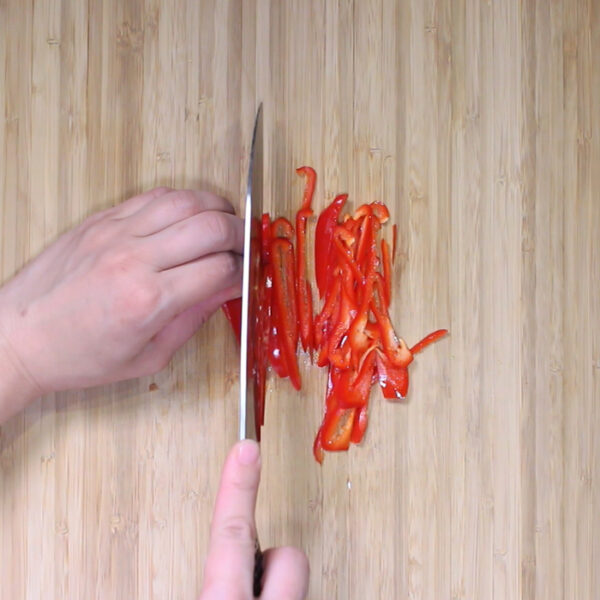 新たまねぎは薄くスライスし、赤ピーマンは細い千切りにする。