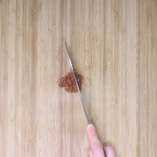 梅干しは種をはずし、包丁でたたく。