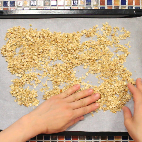 ボウルにオートミール、メープルシロップ、ココナッツ油、シナモン、1を入れてよく混ぜ、オーブンシートを敷いた天板の上に薄く広げる。