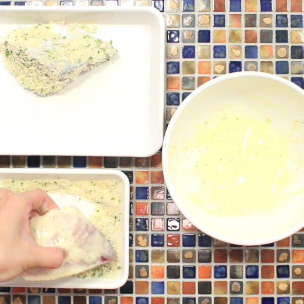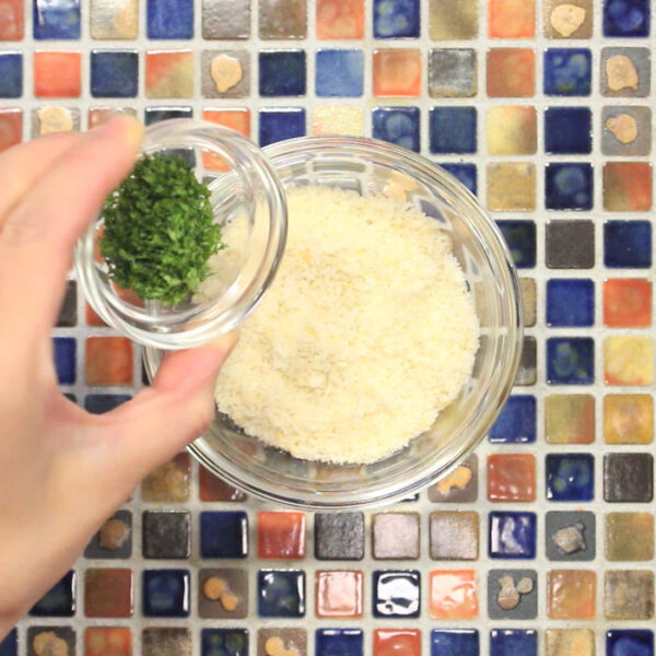 ボウルに天ぷら粉と水を入れて混ぜ、1をくぐらせて2のパン粉をつける。