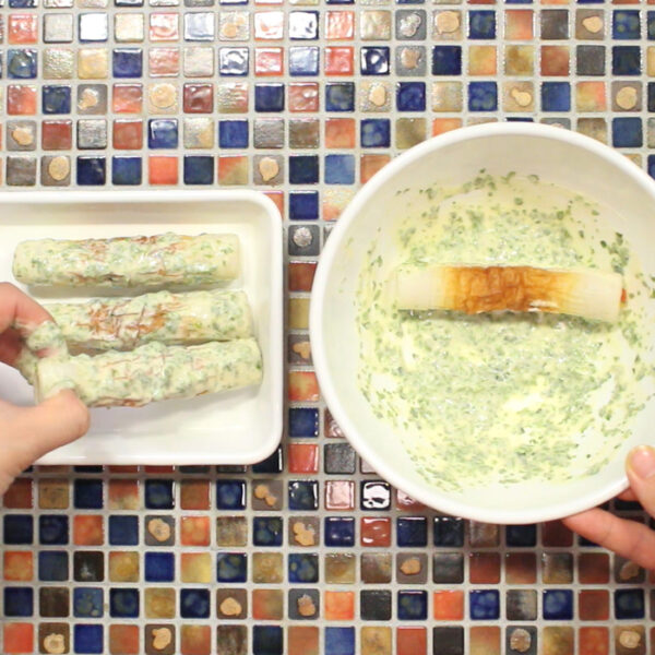 ボウルに天ぷら粉、青のり、水を入れてよく混ぜ、1をくぐらせる。