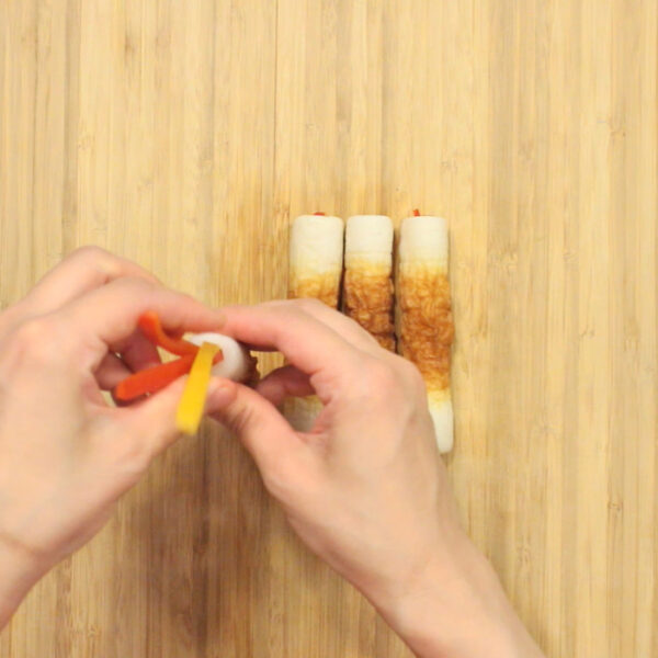 赤、黄パプリカはそれぞれ細切りにし、竹輪の穴に3本ずつ差し込む。