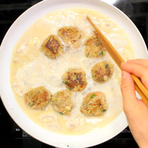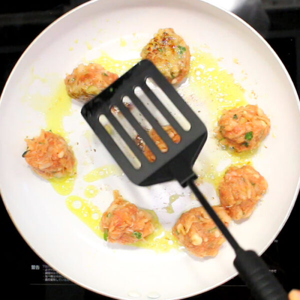 熱したフライパンにオリーブ油をひき、3のタネを卓球玉くらいの大きさに丸め、両面を焼き、一度取り出す。
