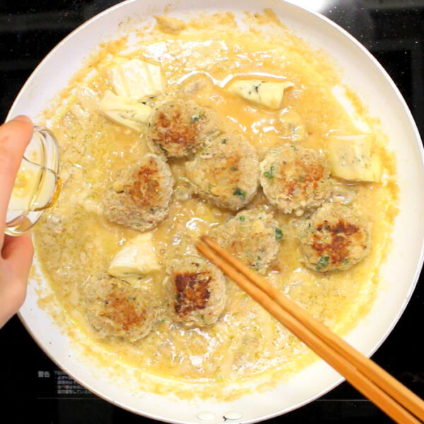 4で出た余分な油をキッチンペーパーでふき取り、2を加えて軽く炒める。白ワインを入れ軽くアルコールを飛ばした後、アーモンドミルク、4を加え加熱する。