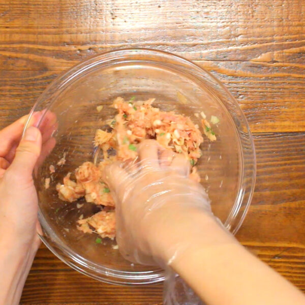 ボウルに豚ひき肉、ナツメグ、塩、胡椒を入れ粘りが出るまでよくこねたら、1、溶いた卵を加え、さらに混ぜ合わせる。