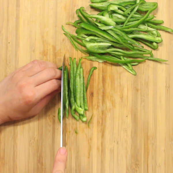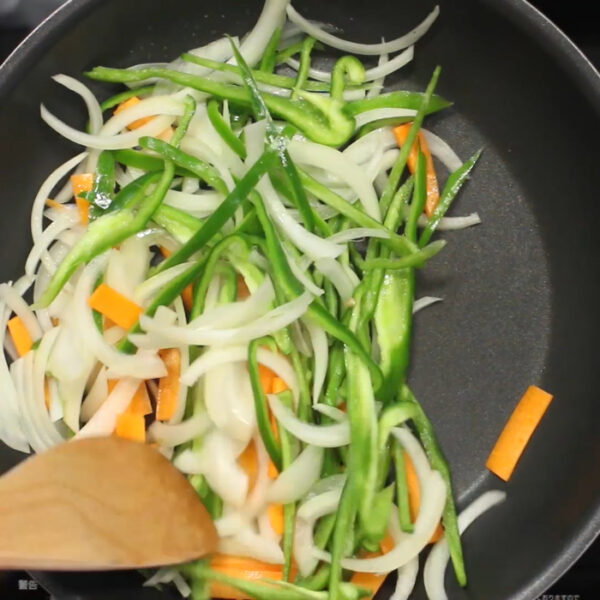 たまねぎ、ピーマンは幅5mmの縦切り、にんじんは短冊切りにする。