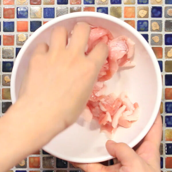 豚ロース薄切り肉を5cmの長さに切ってボウルに入れ、Aを加えて下味を付け、片栗粉をかけて混ぜる。