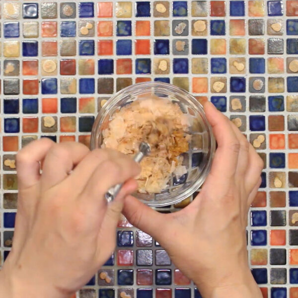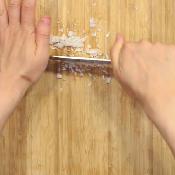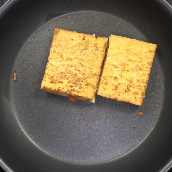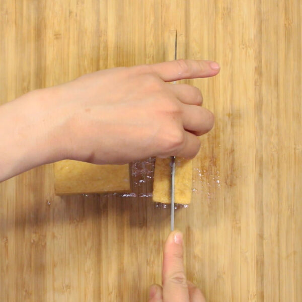 厚揚げを半分の大きさに切り、さらに半分の厚さに切る。
