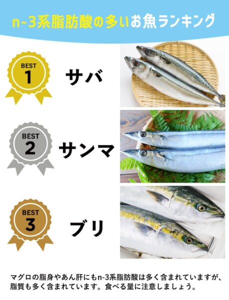 脂質対策において、積極的な摂取を推奨しているのが「魚料理(1日1食目安)」です。 特にサバやサンマなどの青魚には、「n-3系脂肪酸(EPA・DHAなど)」が多く含まれています。