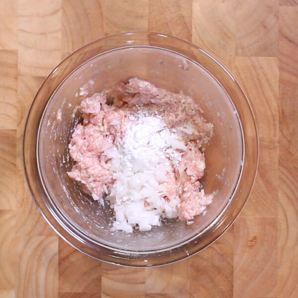 1に鶏むねひき肉を入れてよく混ぜ、Aを加えてさらに混ぜたら、2と片栗粉を加えてさっくりを混ぜる。