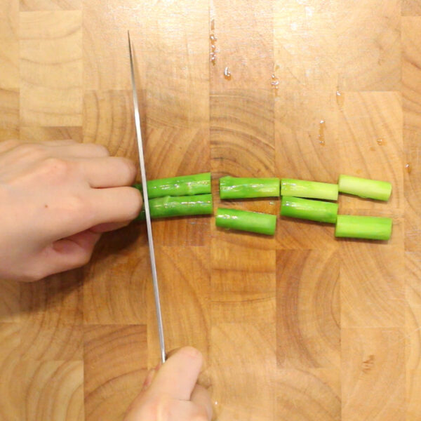 アスパラガスは根元1/3の皮を取り除き、熱湯で塩茹でする。冷水にさらして水気を切り、2cm幅に切る。