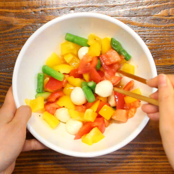 ・野菜を小さく切ることでドレッシングの味が染み込みやすくなります。