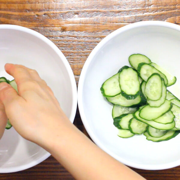 きゅうりは斜め切りにして塩を振って塩揉みし、水気をしっかり絞る。