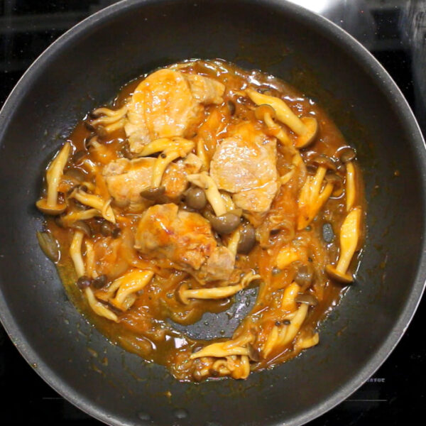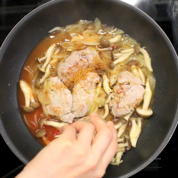 豚ヒレ肉を加え、両面に焼き目が付いたらトマトペースト、水、コンソメを加えて煮る。