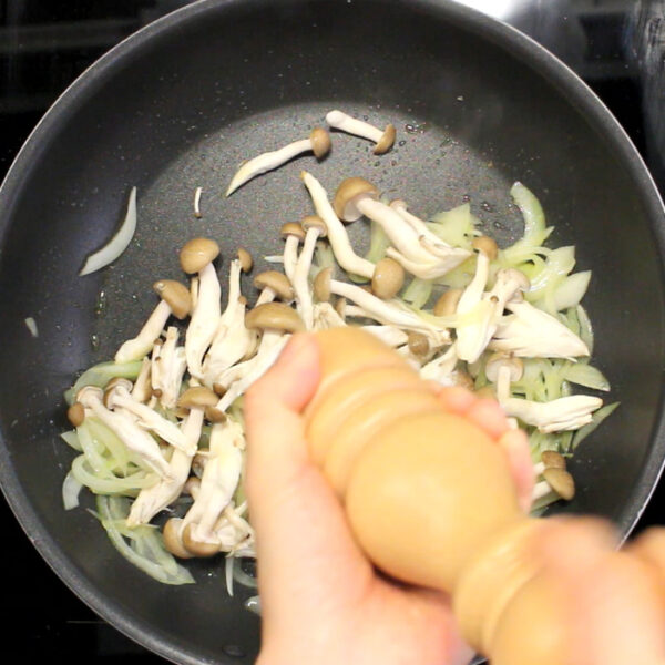 しめじを加え、塩、胡椒をしてさらに炒める。
