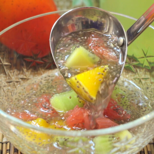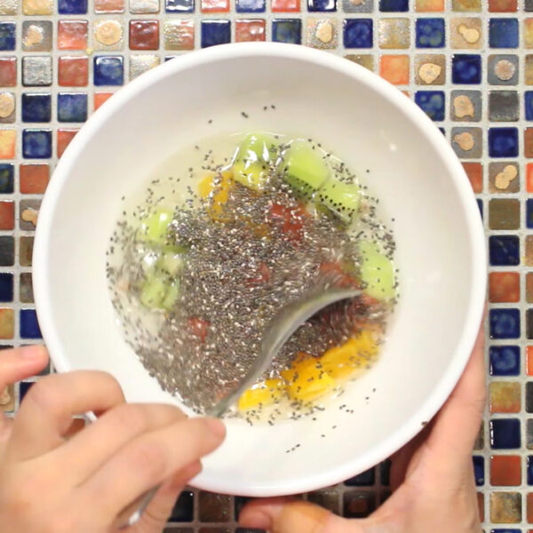 ・チアシードはシロップにつけてしばらく冷やし、ふやかします。
