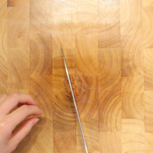 梅干しは種を除き、果肉を包丁でよく叩いてペースト状にする。