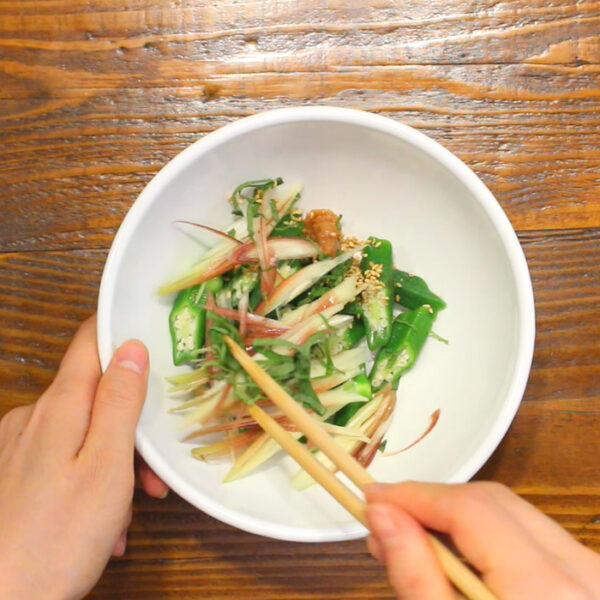 ボウルにオリーブ油、1、2、3、白ごまを加えよく和えて完成。