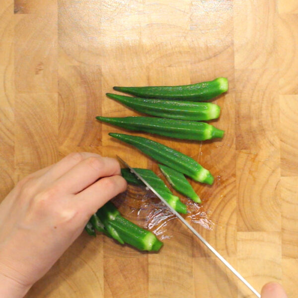 オクラはガクを取って塩(分量外)をふり、まな板の上で板ずりをしてうぶ毛を取る。沸騰したお湯で1~2分程茹で、色止めのために冷水につけたら斜めに4等分に切る。