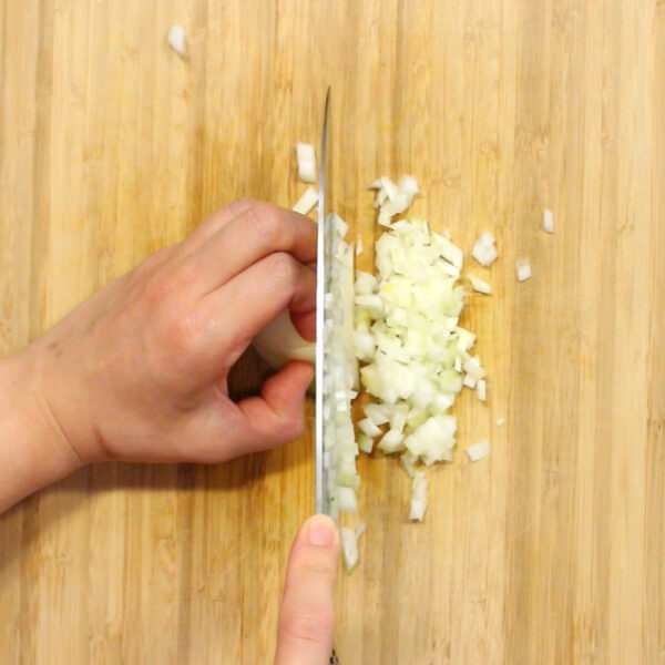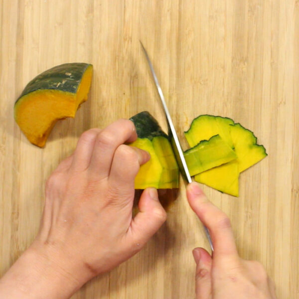 かぼちゃは種とワタを取り、皮の部分をカットして、1cm角に切る。