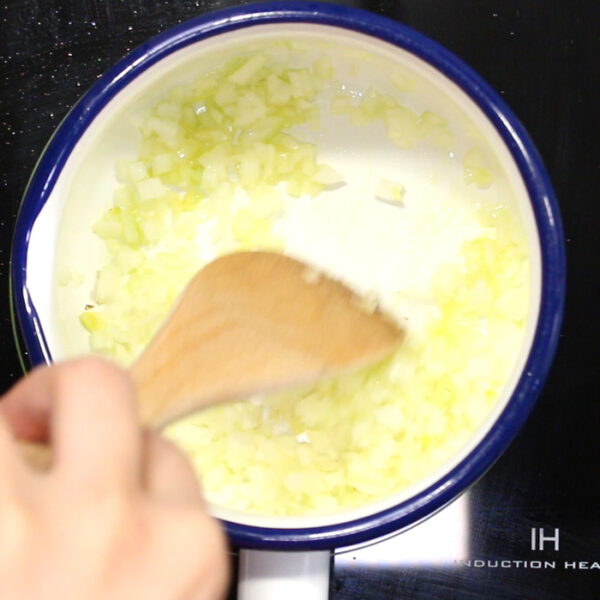お鍋にオリーブ油を入れ、2を入れよく炒め、1を加えさらに炒める。
