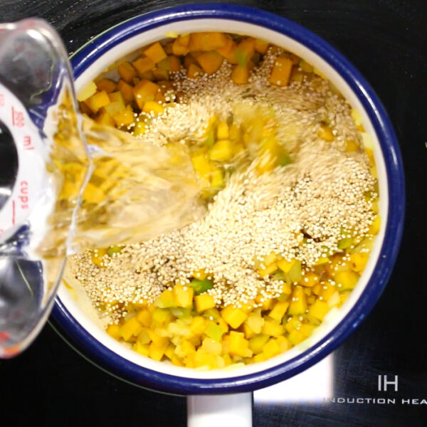 4にキヌア、水、固形ブイヨン、枝豆を入れ、蓋をしてかぼちゃに火が通るまで煮る。