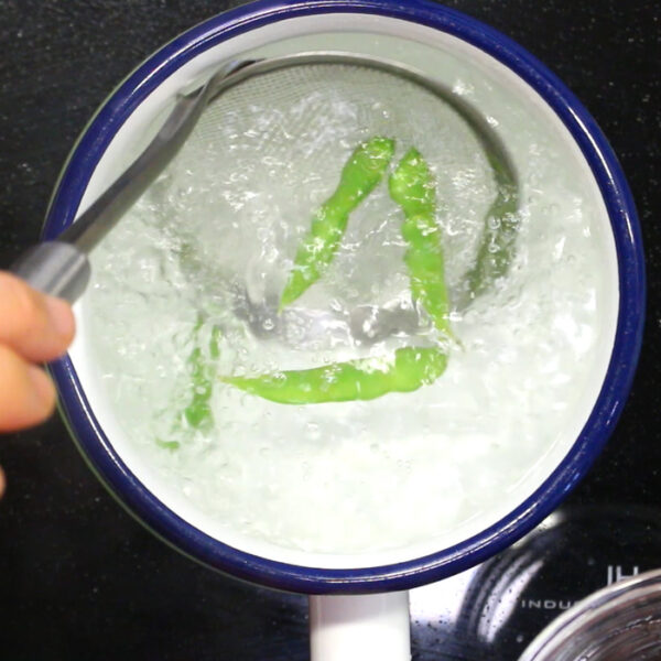 沸騰したお湯に塩(分量外)を入れて、枝豆を茹で、さやから実を取り出す。