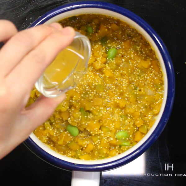 キヌアが戻り、かぼちゃがクタクタになったら白ワインを加え、蓋を開けた状態で水分を飛ばし、かぼちゃがトロトロになるように煮る。