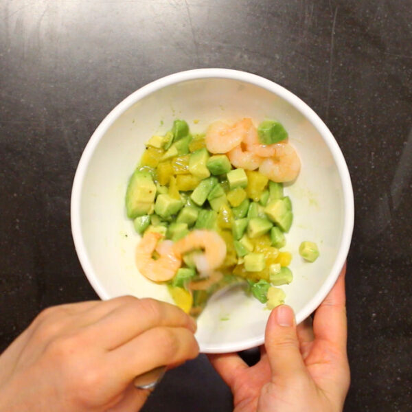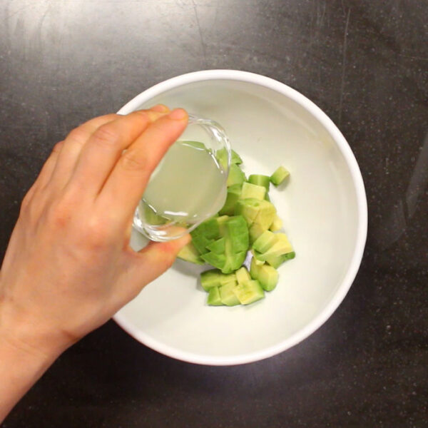 アボカドは種と皮を除いて、約1.5cm角に切り、ボウルに入れレモン汁を加えて和える。